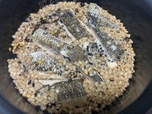 ⑥炊き上がったら、中骨を取り除き、皮つき柵の身をほぐしながら全体を混ぜる