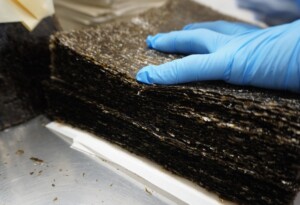 ↓収穫してきた海苔を洗い、さらに細かいゴミを除去しているところ