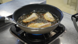 切り身をバッター液にくぐらせ、パン粉をしっかりまとわせます。