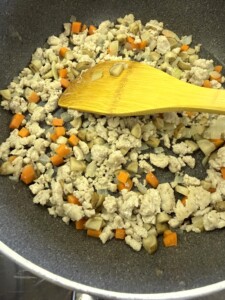 ③ フライパンで野菜を炒め、クロダイミンチも加えてポロポロに。