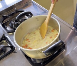 ② 鍋で玉ねぎ・人参を炒め、クロダイミンチ+バターを加えて炒める。