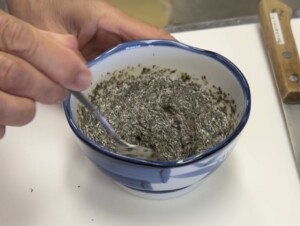 岡山のりを小さくちぎり、お湯を加えて溶かすように混ぜます。