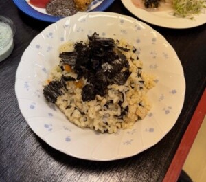 ⑥ 炊き上がったら岡山のり(ちぎったもの)を加えて混ぜ込む。